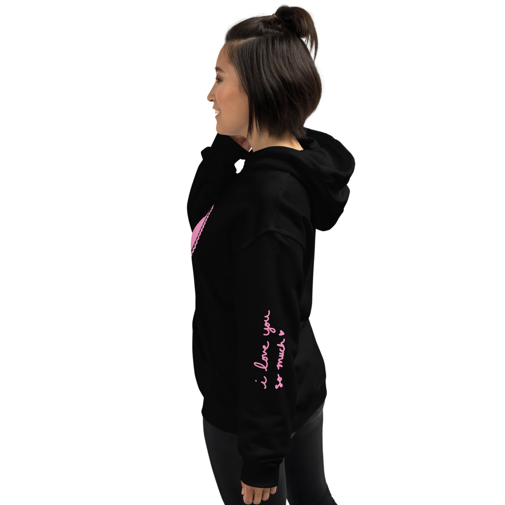 meet your new emotional support hoodie. big pink heart, angel kitty, candy hearts down the sleeve and an "i love you so much" script for when you can't say it out loud. made for soft girls, cat people, and anyone who has definitely sent a risky text at 2 a.m.